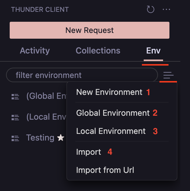 You can use.envfiles in Thunder Client. To use a.envfile follow the below steps:- Create an Environment (using option 1 in above image).