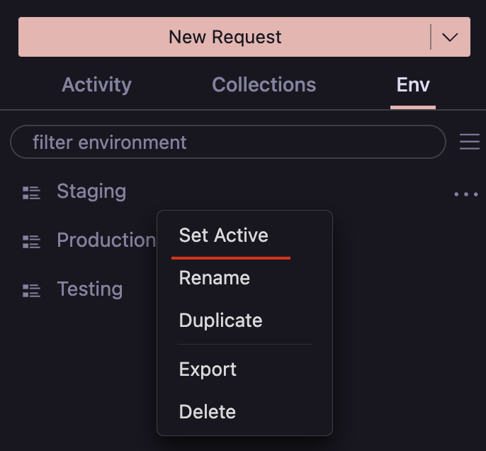 The active environment is the environment currently selected in the Env tab. The active environment is used to resolve variables in requests and scripts.